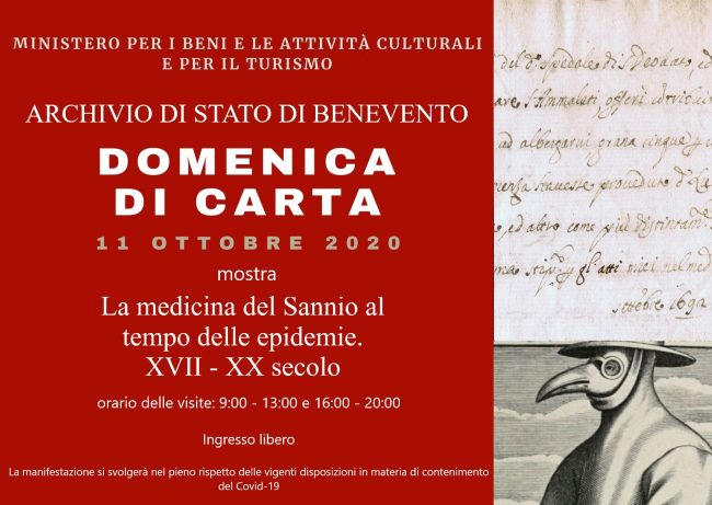 L’Archivio di Stato di Benevento partecipa al progetto di apertura straordinaria delle Biblioteche e degli Archivi di Stato, promosso dal MiBACT per valorizzare e promuovere la conoscenza del patrimonio conservato. Domenica 11 ottobre dalle 9:00 alle 13:00 e dalle 16:00 alle 20:00 sarà possibile visitare la mostra documentaria “La medicina del Sannio al tempo delle epidemie.…